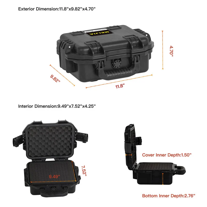 ● Külső dimenzió: 11,8 "x9.82" x4.7 ".Side Dimenzió: 9.49" X7.52 "X4.25" .Cover Belső mélység: 1,5 ".Bottom Belső mélység: 2,76". Teljes mélység: 4,26 ". Súly habbal: 3.00Ibs.A mindazok védelme, amelyet értékel, például lencse, kamerák, drónok, órák.